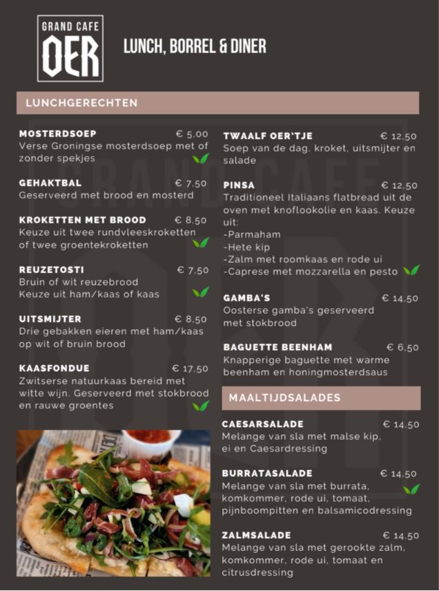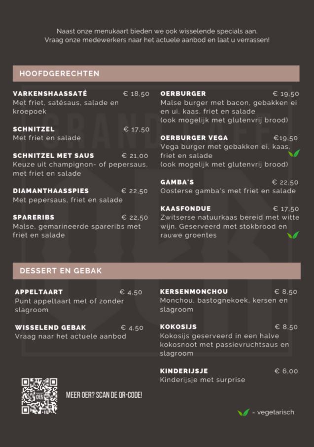 Hieronder vindt u onze menukaart. Naast deze kaart serveren we ook wisselende specials, informeer bij onze medewerkers naar het actuele aanbod.
